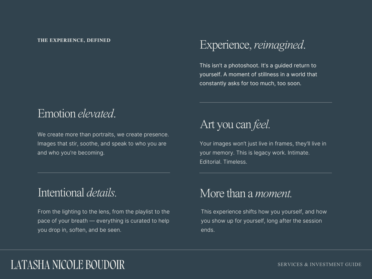 I keep the process transparent and flexible. You’ll have a clear understanding of every option before you book, and you can choose the level of investment that feels right. Payment plans are available to all clients, bringing this experience within reach in a way that aligns with your financial capabilities. There is never any pressure to spend beyond your comfort level.